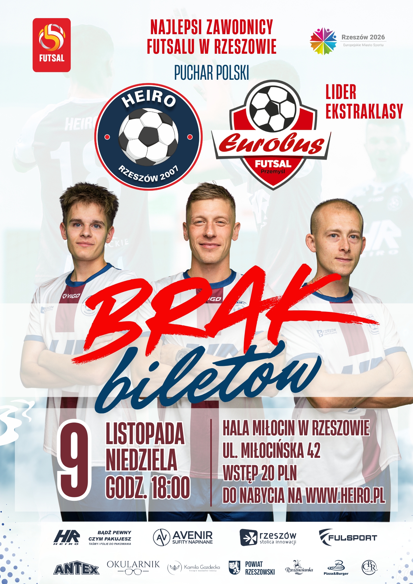 Przed nami prawdziwy futsalowy hit! Już w najbliższy weekend w Rzeszowie miejscowe Heiro podejmie Eurobus Przemyśl w ramach rozgrywek Pucharu Polski. Zainteresowanie spotkaniem przerosło wszelkie oczekiwania — wszystkie bilety zostały wyprzedane, więc czeka nas pełna hala i gorąca atmosfera.